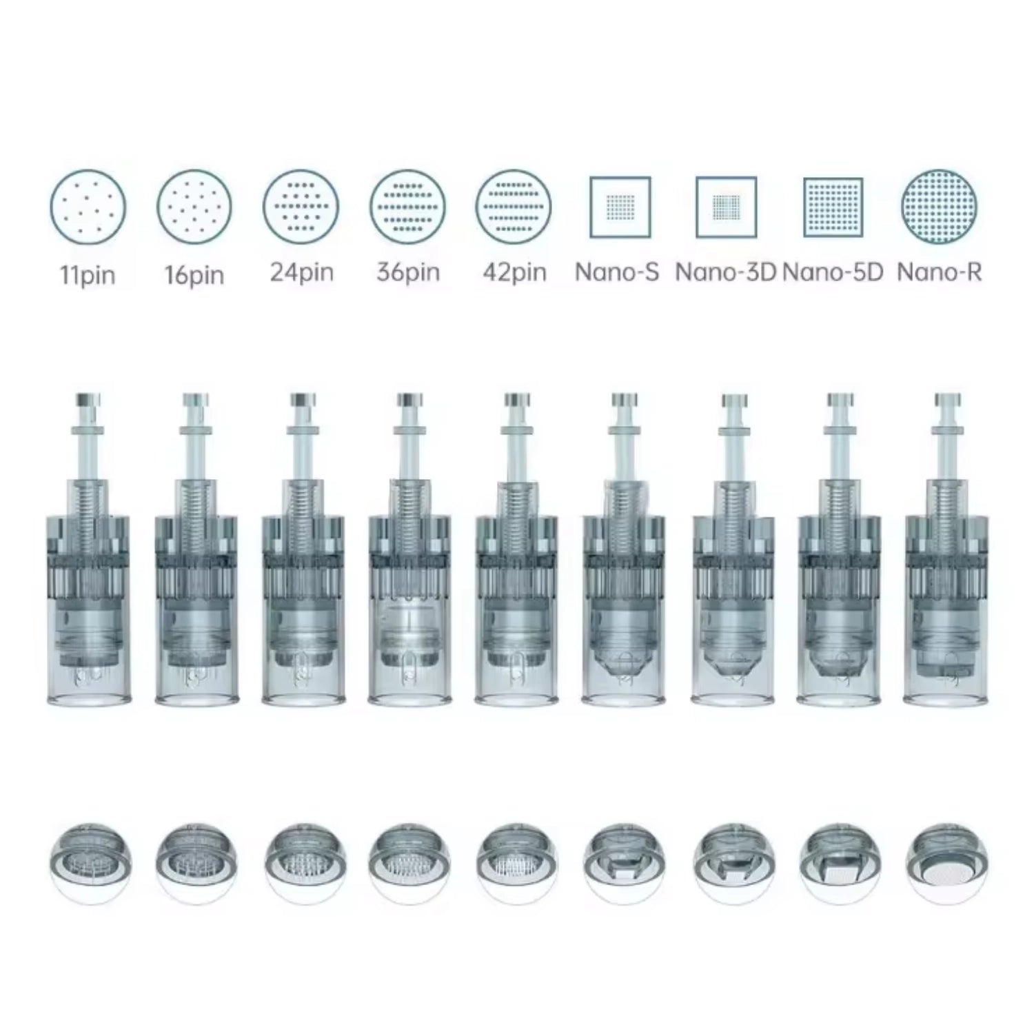 Este pack incluye nueve tipos de agujas y puntas nano diseñadas para diferentes necesidades cosméticas: