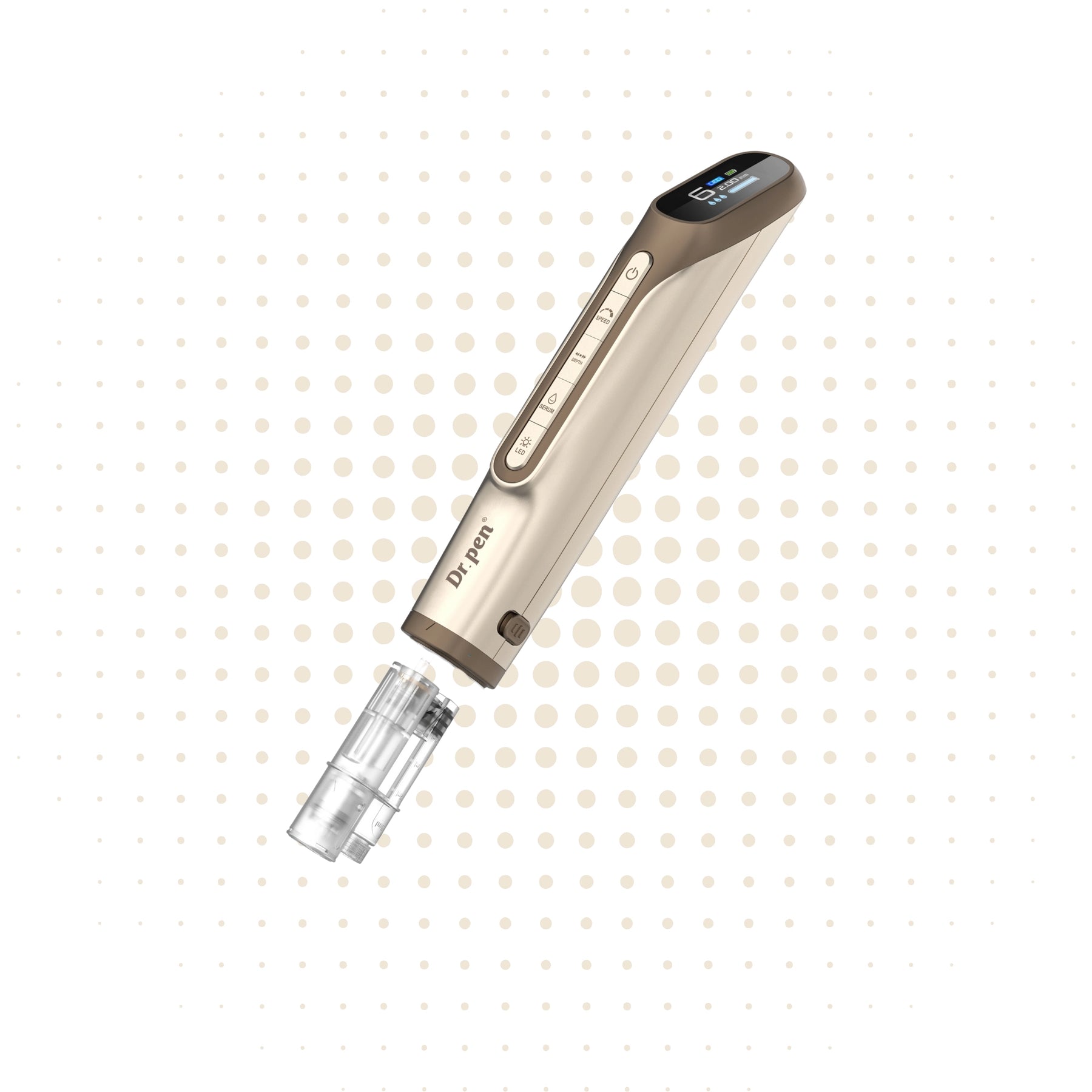 El Dr. Pen H6 incorpora un cartucho desmontable con depósito de suero integrado de 3 ml, diseñado para una aplicación más precisa y uniforme. El cartucho cuenta con un chip inteligente que se sincroniza con el dispositivo para regular el flujo de suero y evitar el retorno del líquido.